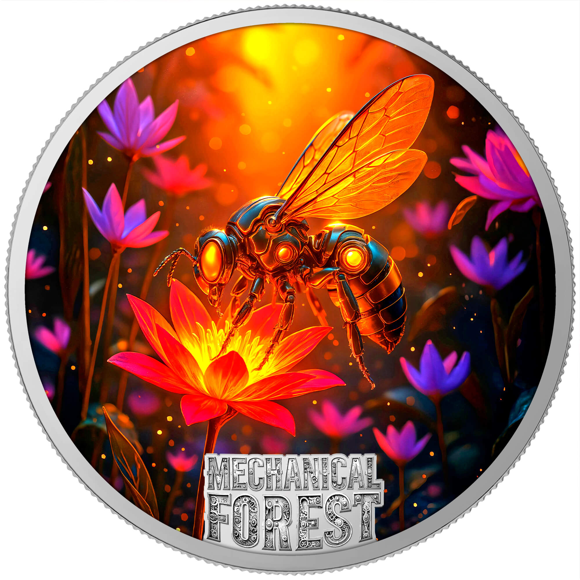 Mechanische Biene verkörpert die Energie und Präzision eines neuen Ökosystems, in dem sich die Natur über das Organische hinaus entwickelt. In ihr verwandelt sich die Zartheit des Lebens in leuchtende Ingenieurskunst und erschafft ein ebenso kraftvolles wie hypnotisches Stück. Eine Münze, die den lebenswichtigen Puls des Mechanical Forest und das Gleichgewicht zwischen Technologie und Schönheit symbolisiert.