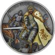The reverse of the coin shows Arthur Pendragon fighting his enemies. He holds the sword Excalibur in his hand. Two other warriors protect the king’s back, while another has already fallen.